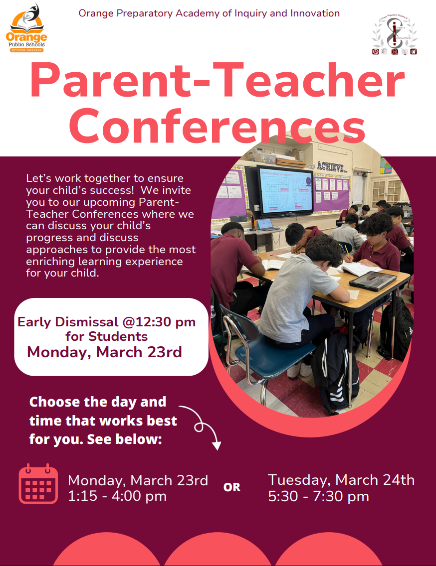Hello Orange Prep Families:We are excited to invite you to our parent teacher conferences which are scheduled for Monday, March 23rd (1:15 pm - 4:00 pm - this is a half day for students) and Tuesda...