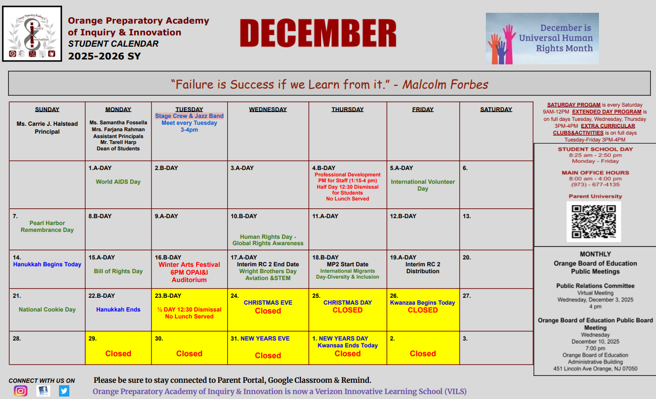 Good Evening Orange Prep Family:Please see the attached calendar for December 2025. Remember Wednesday, November 26, 2025 is a half for staff and students. There will be no lunch served. Have a w...
